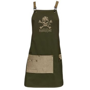 Kvalitní tmavě zelená barber zástěra od značky Pirates of the BARBERTIME s prostornými kapsami a kovovým poutkem. Vyrobeno z materiálu, který dokonale odpuzuje vodu, zapínání je řešeno nastavitelnými koženými řemínky.