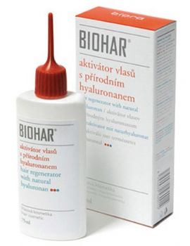 BIORA - BIOHAR aktivátor vlasů s přírodním hyaluronanem * Působí proti nadměrnému vypadávání vlasů u mužů i žen, zlepšuje pevnost i pružnost vlasů, snižuje i tvorbu lupů * Biohar působí přirozenou cestou proti zvýšenému vypadávání vlasů a regeneruje tvorbu nových vlasů * Umožňuje regulaci krystalicky vázané vody a současně cíleně transportuje do vlasové pokožky růstové polypeptidy a vitamíny, čímž dochází k aktivaci vlasových kořínků * Nově rostoucí vlasy jsou bohatší a kvalitnější, je omezeno jejich vypadávání, třepení a lámavost * Aplikací jsou stimulovány vlasové kořínky, výsledkem je regenerovaná pokožka a hustší vlasy * Dávkování a způsob užití: Denně aplikujte sérum a jemně masírujte pokožku hlavy, poté opláchněte vodou. Po umytí nevystavujte pokožku mrazu *