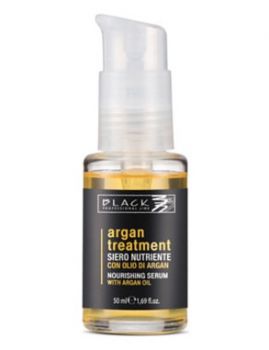 BLACK PROFESSIONAL - Argan Treatment Serum 50ml - bezoplachové arganové vlasové sérum na velmi poškozené vlasy * Arganový olej vyživuje a hydratuje poškozené vlasy zevnitř * Zaceluje konečky a tím zamezuje třepení a lámání křehkých vlasů * Vhodný pro konečnou úpravu * ARGAN TREATMENT obohacený o arganový olej z Maroka speciálně určený pro poškozené vlasy. Léčba pro vlasy a jejich konečky, které se mohou třepit a lámat z přirozených příčin nebo díky vnějším vlivům, jako je teplé nebo chladné počasí, vítr, déšť, sluneční záření nebo také vlivem barvení a odbarvování. Zároveň chrání a současně vyživuje vlasy a vlasovou pokožku * ARGAN TREATMENT obohacený čistým arganovým olejem je ideální pro všechny typy vlasů, pomáhá obnovit a hydratovat vlasy od kořínků ke konečkům. Vlasy zůstávají neuvěřitelně měkké a lesklé * Neoplachiuje se *