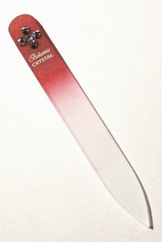 BOHEMIA CRYSTAL - Skleněný pilník na nehty délka 90mm, šířka 11,5mm, tloušťka 2mm * Různé vzory obrazců složené ze Swarovski komponentů * Velmi kvalitní provedení * Ručně dokončované * PVC pouzdro * Brusná plocha - brusné oboustranné plochy jsou leptány zcela novou technologií, která zajišťuje jedinečnost mezi výrobci a maximální ostrost. Samotná brusná plocha je nezničitelná * Mechanická pevnost - při běžném používání nepraskne a je odolný vůči pádu na změkčené povrchy - lino, koberec. Po dopadu na tvrdé předměty jako kámen, dlaždici nebo beton dojde samozřejmě k jeho mechanickému poškození * Údržba - po použití pilník opláchněte proudem vody. Při větším znečištění můžete použít kartáček a saponát. Lze jej též vyvařit, sterilizovat nebo dezinfikovat * Kvalita, pevnost odolnost a funkčnost pilníku byla testována a schválena autorizovanou zkušebnou *