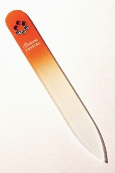 BOHEMIA CRYSTAL - Skleněný pilník na nehty délka 90mm, šířka 11,5mm, tloušťka 2mm * Různé vzory obrazců složené ze Swarovski komponentů * Velmi kvalitní provedení * Ručně dokončované * PVC pouzdro * Brusná plocha - brusné oboustranné plochy jsou leptány zcela novou technologií, která zajišťuje jedinečnost mezi výrobci a maximální ostrost. Samotná brusná plocha je nezničitelná * Mechanická pevnost - při běžném používání nepraskne a je odolný vůči pádu na změkčené povrchy - lino, koberec. Po dopadu na tvrdé předměty jako kámen, dlaždici nebo beton dojde samozřejmě k jeho mechanickému poškození * Údržba - po použití pilník opláchněte proudem vody. Při větším znečištění můžete použít kartáček a saponát. Lze jej též vyvařit, sterilizovat nebo dezinfikovat * Kvalita, pevnost odolnost a funkčnost pilníku byla testována a schválena autorizovanou zkušebnou *