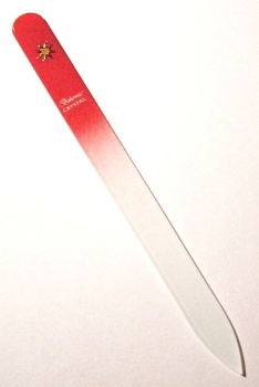 BOHEMIA CRYSTAL - Skleněný pilník na nehty délka 140mm, šířka 11,5mm, tloušťka 2mm * Různé vzory obrazců * Velmi kvalitní provedení * Ručně dokončované * PVC pouzdro * Brusná plocha - brusné oboustranné plochy jsou leptány zcela novou technologií, která zajišťuje jedinečnost mezi výrobci a maximální ostrost. Samotná brusná plocha je nezničitelná * Mechanická pevnost - při běžném používání nepraskne a je odolný vůči pádu na změkčené povrchy - lino, koberec. Po dopadu na tvrdé předměty jako kámen, dlaždici nebo beton dojde samozřejmě k jeho mechanickému poškození * Údržba - po použití pilník opláchněte proudem vody. Při větším znečištění můžete použít kartáček a saponát. Lze jej též vyvařit, sterilizovat nebo dezinfikovat * Kvalita, pevnost odolnost a funkčnost pilníku byla testována a schválena autorizovanou zkušebnou *