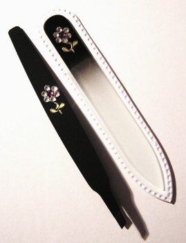 BOHEMIA CRYSTAL - Skleněný pilník na nehty délka 90mm, šířka 11,5mm, tloušťka 2mm + šikmá kosmetická pinzeta vynikající kvality - 97mm * Různé vzory obrazců složené ze Swarovski komponentů * Velmi kvalitní provedení * Ručně dokončované * PVC pouzdro * Brusná plocha - brusné oboustranné plochy jsou leptány zcela novou technologií, která zajišťuje jedinečnost mezi výrobci a maximální ostrost. Samotná brusná plocha je nezničitelná * Mechanická pevnost - při běžném používání nepraskne a je odolný vůči pádu na změkčené povrchy - lino, koberec. Po dopadu na tvrdé předměty jako kámen, dlaždici nebo beton dojde samozřejmě k jeho mechanickému poškození * Údržba - po použití pilník opláchněte proudem vody. Při větším znečištění můžete použít kartáček a saponát. Lze jej též vyvařit, sterilizovat nebo dezinfikovat * Kvalita, pevnost odolnost a funkčnost pilníku byla testována a schválena autorizovanou zkušebnou *
