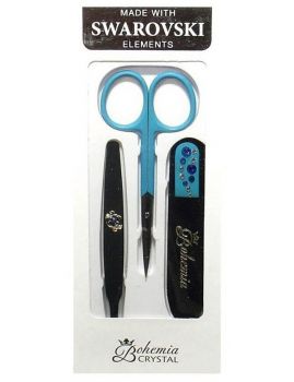 BOHEMIA CRYSTAL - Dárkový set Manikura Swarovski - Skleněný pilník na nehty délka 90mm, šířka 11,5mm, tloušťka 2mm + šikmá kosmetická pinzeta vynikající kvality - 97mm + manikurní nůžky na nehty * Různé vzory obrazců složené ze Swarovski komponentů * Velmi kvalitní provedení * Ručně dokončované * Brusná plocha - brusné oboustranné plochy jsou leptány zcela novou technologií, která zajišťuje jedinečnost mezi výrobci a maximální ostrost. Samotná brusná plocha je nezničitelná * Mechanická pevnost - při běžném používání nepraskne a je odolný vůči pádu na změkčené povrchy - lino, koberec. Po dopadu na tvrdé předměty jako kámen, dlaždici nebo beton dojde samozřejmě k jeho mechanickému poškození * Údržba - po použití pilník opláchněte proudem vody. Při větším znečištění můžete použít kartáček a saponát. Lze jej též vyvařit, sterilizovat nebo dezinfikovat * Kvalita, pevnost odolnost a funkčnost pilníku byla testována a schválena autorizovanou zkušebnou *
