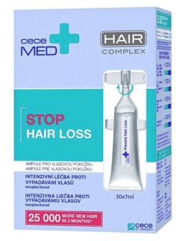 CECE MED - Stop Hair Loss Ampoules 30x7ml * Vlasové ampule proti vypadávání vlasů * Intenzivní ošetření proti vypadávání vlasů současně stimuluje růst nových vlasů * Cece MED ampule obsahují 16 speciálních aktivních složek, které podporují růst vlasu a posilují slabé vlasové kořínky * Ampule pro jednu aplikaci na pokožku hlavy (lze použít i opakovaně díky speciálnímu uzávěru) * Balení obsahuje 30 ampulí pro měsíční komplexní ošetření a regeneraci vlasové pokožky * Účinnost potvrzena testy * Aktivní složky: VITAMIN A - VITAMIN B6 - VITAMIN E - VITAMIN H (Biotin) - OLEJ Z PŠENIČNÝCH KLÍČKŮ - RÝŽOVÉ PROTEINY - ŽELEZO - ZINEK - PROTEINY Z LUPINY BÍLÉ – KERATIN - PANTHENOL *