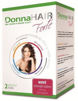 Donna HAIR se skládá z ideální kombinace účinných vitamínů a látek, které mají výborný vliv na výživu vlasů a pokožky * podporuje látkovou výměnu a růst vlasů * tyto vitamíny na vlasy jsou důležité pro všechny, kteří chtějí mít silnější nebo delší vlasy * nejdůležitější jsou ale vitamíny na vlasy pro ty, kterým vlasy vypadávají a nerostou nové * minerály a látky obsažené ve vitamínech DonnaHAIR pomáhají ke zpevnění vlasové kůže, zlepší její prokrvení a tím dochází k růstu nových vlasů * nedostatek vitaminů vede k vypadánání vlasů, lámavosti a třepení, způsobuje kožní problémy, zvyšuje se lámavost kostí a projevuje se únavou.