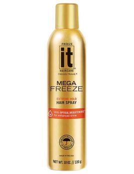 FREEZE IT - MEGA FREEZE HAIR SPRAY 24HOUR EXTREME HOLD 283g * extrémně tužící rychleschnoucí lak na vlasy s leskem tzv. "Zmrazovač" * k nekompromisnímu zafixování účesu po dobu 24hodin * určen k fixaci drdolů, společenských a jinak složitých účesů * UV ochrana proti slunečnímu záření * odolný proti vlhkosti * obsahuje Panthenol Vitamin B-5 * určen pro všechny typy vlasů * nelepí a nezanechává šupinky * antistatický efekt - zabraňuje elektrizování vlasů * dodává vlasům maximální lesk * patentovaná technologie Optical Brighteners zajistí hnědým vlasům sytost barvy, červené rozzáří, černé oživí a blond vlasům dodá přirozený vzhled *