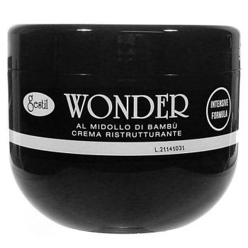 GESTIL WONDER - Al Midollo Di Bambú Crema Ristrutturante Intensive Formula 500ml * Regenerační zábalový vlasový krém Wonder * Vlasová maska Wonder se doporučuje, díky svému výjímečnému složení, na vlasy s poškozeným vláknem, na vlasy zničené nebo narušené vlivem trvelé, barvení, melírování, smogu a vlasy jemné se sklonem k padání * Regenerační krém s výtažkem z bambusu dodává vlasu velký lesk, hebkost a hydrataci * Vlasy jsou po jeho použití, díky účinným látkám obsažených v této vlasové masce, velmi intenzivně ošetřeny a velmi dobře rozčesatelné * Nechává se působit po každém umytí 3 - 5 minut a potom se opláchne důkladně vodou * Tato vlasová maska je výborná také na intenzivní zábaly na 30 - 60 minut , kdy se na vlasy po umytí regeneračním šamponem Wonder a opláchnuté vodou, nanese táto maska, nechá se působit požadovaný interval a po poté se důkladně opláchne vodou * Díky této regenerační kůře budou Vaše vlasy opět mladé a krásné *