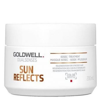 GOLDWELL DUALSENSES - Sun Reflects After Sun 60sec Treatment 200ml * Ochranná 60sekundová maska na vlasy narušené nepříznivými vlivy, UV paprsky, chlor z bazénu a mořská voda, které nechávají vlasy bez lesku a narušené * Maska regeneruje intenzivně vlasy, dodává bohatou hydrataci * Pro viditelně třpytivější lesklé vlasy a pocit zdravých, hladkých vlasů. Ideální i pro barvené vlasy * Maska má nádhernou vůni po mangu * Aktivní látky: Okamžitá ochrana a regenerace díky inovační technologii: Sun System s olejem z maracuji a UV filtrem obaluje vlasy rovnoměrně díky Instant Microfluid Technology * Poskytuje vlasům bohatou hydrataci, ochranu před poškozením a ztrátou lesku * Instant Microfluid Technology pro rychlou a rovnoměrnou distribuci účinných látek do vlasů *