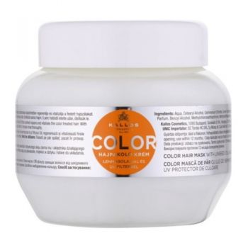 KALLOS COSMETICS - KJMN Color Hair Mask 275ml * Regenerační maska pro barvené a poškozené vlasy * Obsahuje UV filtr a společně s lmněným olejem regeneruje a chráni vlasy před poškozením, vrací vlasům původní strukturu, jemnost a brilantní lesk * Po použití jsou vlasy viditelně ošetřené, lesklé a lehce rozčesatelné * Naneste na umyté a ručníkem prosušené vlasy, nechte působit 5 minut a dobře opláchněte! *