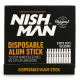 Kamencové sirky NISH MAN Disposable Alum Stick obsahuje 20 kusů chladících tyčinek. Jedná se o jednorázové sirky kamence pro zastavení drobných ran při holení. Vhodné jsou nejen pro domácí použití, ale také jako hygienický způsob zacelení ranek v barbershopech či holičstvích. Styptické zápalky se v jednotlivých balíčcích snadno přenášejí a také se hodí jako maloobchodní produkt vedle pokladny v každém barbershopu.