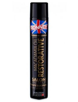 RONNEY London - Restorative Macadamia Oil Hair Spray 750ml - extra silný lak na vlasy * Obsahuje výtažky z macadamiových ořechů, které pomáhají vlasy hydratovat a vyživovat * Vhodný pro oslabené a vypadávající vlasy * Navrženo pro konečné zpevnění účesu * Rychleschnoucí lak nezatěžuje vlasy, poskytuje dlouhotrvající účinek, chrání před škodlivými účinky vlhkosti a nepřiznivými vlivy počasí * Použití: Aplikujte na suché vlasy ze vzdálenosti 30 cm *