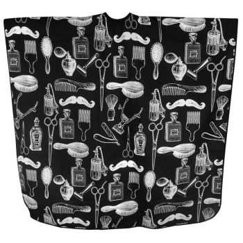 SALON KOMPLET - Barber Instrument - pánská stříhací pláštěnka - černá * Profesionální pláštěnka je v černé barvě se stylovým vzorem kadeřnických a barber nástrojů * Vyrobeno z antistatického a voděodolného polyesteru * Rozměry: 128 x 155 cm * Materiál: 100% polyester * Zapínání na háčky *