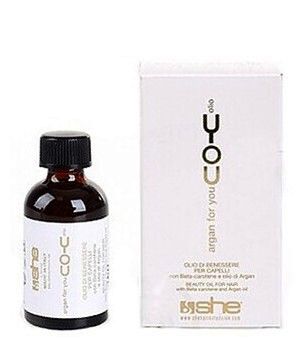 SO.CAP. HAIR EXTENSION - SHE ARGAN FOR YOU - Beauty Oil For Hair 30ml * Pěstící olej na vlasy s arganovým olejem s beta-karotenem * Olej k intenzivnímu ošetření pro všechny typy vlasů na bázi arganového oleje a beta-karotenu * Okamžitě se vstřebá, nemastí, nezanechává zbytky * Poskytuje hlubokou hydrataci a vlasy zanechá hedvábně jemné s neuvěřitelnými odlesky * Napomáhá odstranit rozdvojené konečky vlasů * SHE arganový olej je bohatý na vitamin E (přírodní antioxidant) posiluje vlasy a chrání před volnými radikály a zestárnutím, obnovuje energetické rezervy vlasového vlákna * Obsahuje UV filtr * Obsahuje ty nejkvalitnější ingredience * SHE Argan For You Oil může být použit mnoha způsoby a je idaálním partnerem každého kadeřníka * Použití: Při barvení vlasů - olej se může použít ve směsi s barvou pro ještě zářivější odlesky a k větší ochraně vlasu. Naneste asi 5ml výrobku do vlasů před aplikací barvícího krému nebo zesvětlovače. Vlasy promasírujte, aby se zlepšilo vstřebání výrobku a již neoplachujte. Přidejte 3-5ml oleje do směsi barvy a pokračujte jako obvykle. Vyživené regenerované vlasy budou jemnější a barva bude zářivější. Jako ochrana - složky oleje chrání vlasy proti atmosferickým vlivům a znečišění. Přírodní antioxidanty arganový olej a betakaroten působí jako bariera proti stárnutí a volným radikálům. Aplikujte nekolik kapek na suché vlasy a rovnoměrně rozetřete. Styling a proti krepatění - olej působí proti krepatění, zkracuje dobu sušení, zjednodušuje úpravu. Zanechává vlasy jemnější, hladší a lesklejší. Aplikujte pár kapej do vlhkých vlasů a vysušte * Made in Italy *
