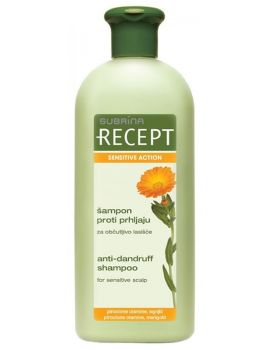 SUBRÍNA RECEPT - Antidandruff Shampoo Sensitive Scalp 400ml * šampon proti lupům na citlivou pokožku hlavy * tento velmi jemný šampon obsahuje aktivní složku octopirox, která účinně odstraňuje lupy a přitom nepožkozuje přírodní mikrofloru zdravé pokožky hlavy * Octopirox zároveň o vlasy pečuje a dává jim pružnost a lesk * Výtažek z měsíčku, který šampon obsahuje, působí protizánětlivě, antisepticky a uklidňuje pokožku hlavy * díky svým jedinečným vlastnostem, složením, kvalitou a účinky byla celá řada výrobků Subrina Recept povolena k prodeji v lékárnách *