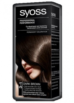 SYOSS PROFESSIONAL PERFORMANCE - Permanent Coloration * Permanentní barva na vlasy s intenzivními barvicími pigmenty pro dlouhotrvající intenzivní barevný výsledek * Profesionální krytí šedin * Zdravě lesklé vlasy * Tmavě hnědý odstín 3-1 je intenzivní tmavě hnědá pro bohatou vlasovou barvu * Vysoce účinná receptura vlasových barev SYOSS uzavírá intenzivní barvicí pigmenty hluboko uvnitř vlasu pro dosažení dlouhotrvající barvy plné lesku s extra péčí díky Nutri-Care komplexu * Příjemná nedráždivá vůně při nanášení * Profesionální kvalita-profesionální výsledky *