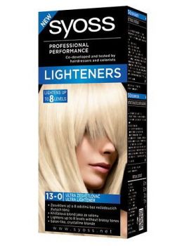 SYOSS PROFESSIONAL PERFORMANCE - LIGHTENERS - Ultra Lightener 13-0 * Vysoce účinný Intenzivní zesvětlovač, který zesvětlí vlasy až o 8 odstínů a dodá vám zářivou a oslnivou blond barvu * Zesvětlovače SYOSS jsou zesvětlovače profesionální kvality pro domácí použití * S posilujícím komplexem s hedvábným proteinem vám SYOSS zesvětlovače dodají zářivou blond barvu s péčí - jako ze salonu *