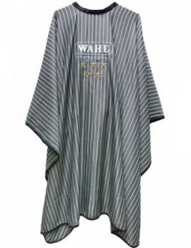 Profesionální kadeřnický plášť XL šedý s bílými pruhy a s vyšitými 5ti hvězdami a logem WAHL. Luxusní holičská pláštěnka Wahl se zapínáním na kovové háčky. Antistatický a voděodolný povrch. Tradiční retro barber design. Velikost XL: Extra large size, větší průměr kolem krku. Zapínání na kovové háčky. Rozměr: 135x150 cm * 60% Polyester + 40% Nylon.